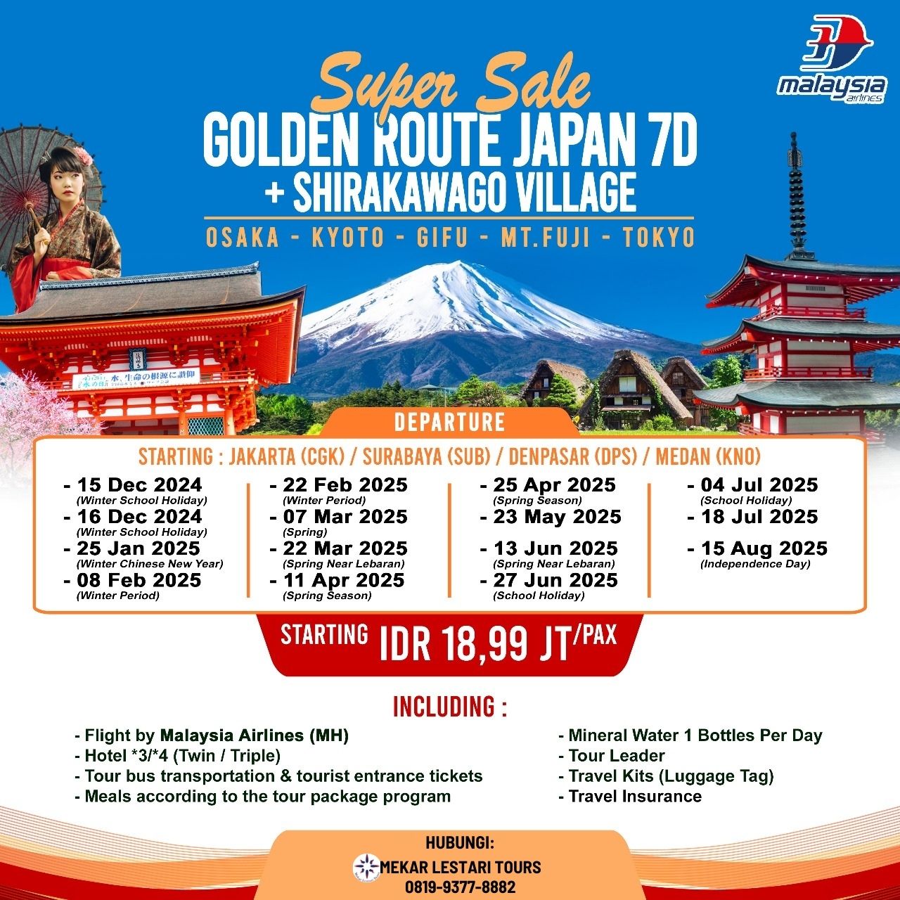 Itinerary 7D Super Sale Japan Golden Route Start Surabaya / Jakarta / Denpasar Bali / Kuala Namu Medan